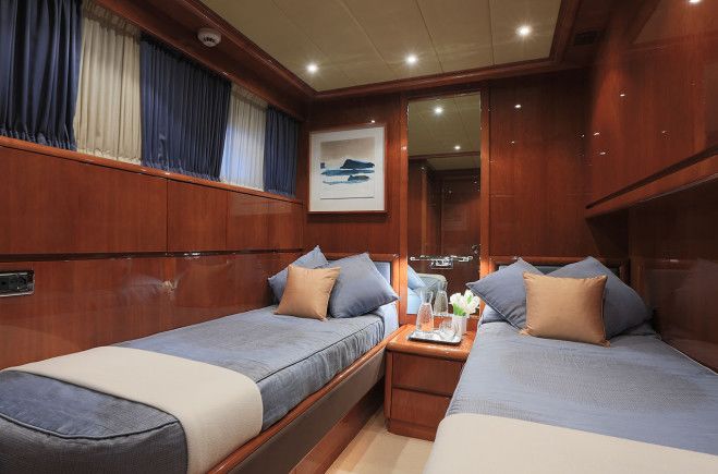 Ylang Ylang offers comfortable accommodation for 10 guests in 1 master, 2 VIP and 2 Twin cabins. She can possibly accommodate 2 children on Pullman berths - One VIP cabin on the main deck forward - Second VIP Cabin on the lower deck forward - Master Cabin on the lower deck aft - 2 Mirror twin cabins equipped with Pullman on the lower deck Please note that Ylang Ylang can accommodate a maximum of 10 adults on board. No more than 10 adults on board for sleeping. 12 guests sleeping is including the 2 Pullman beds and it is only for children.