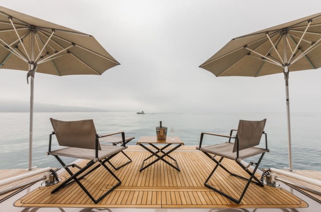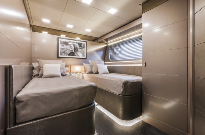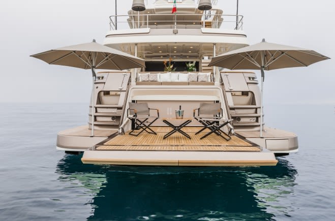 Естественное освещение и просторные объемы являются доминирующими элементами интерьеров: в гостиной сплошные окна тянутся от носа до кормы, в то время как на второй палубе круговые застекленные двери создают ощущение неразрывной ежесекундной связи с просторами моря. Едва увидев инновационный гараж и плавательную платформу, вы за секунду станете настоящим поклонником этой прекрасной яхты: в затопляемом гараже разместились водометный тендер длиной 4,5 метра, который можно спустить на воду без использования фишбалки, плавательная платформа, которая увеличивается до 15 квадратных метров, на ней стоят два зонта и пара шезлонгов — и вот уже это место превращается в фантастический пляж для принятия солнечных ванн. Даже кокпит предлагает оригинальную многофункциональную зону для загара, которую можно использовать 5 разными способами.