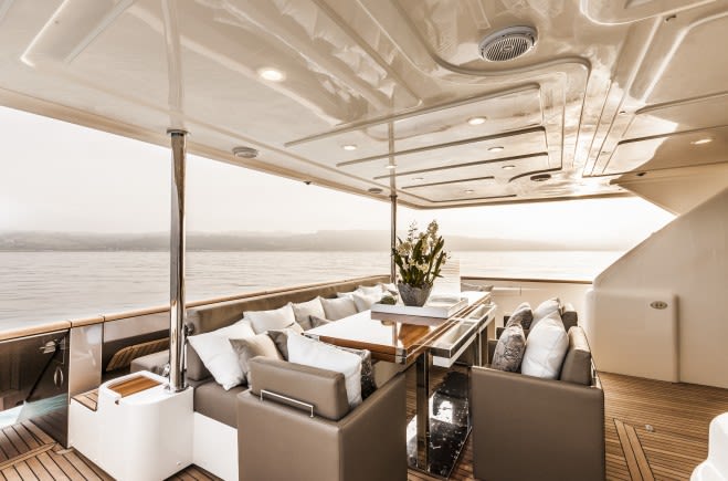 Панорамная верхняя палуба подчеркивается круговой системой стеклянных раздвижных дверей, которая охватывает обеденную зону. Также эта система соединяет внутренние помещения с наружными площадками, которые, в свою очередь, необычайно просторные.
