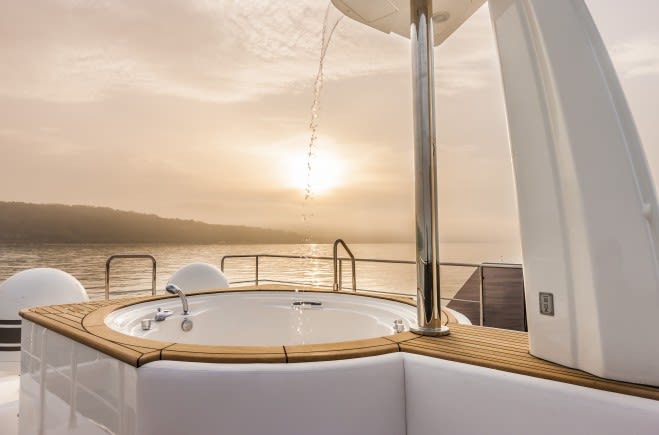 Напоследок, поднявшись на третью палубу, вы обнаружите очень уединенное место. На верхней палубе также оборудована ванна jacuzzi и стоячий душ, над частью подушек для загара обустроен навес, а высокий фонтан льет воду прямо в Jacuzzi.