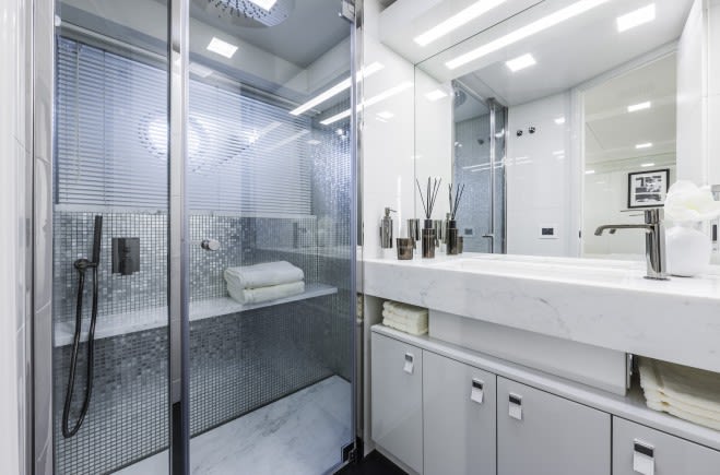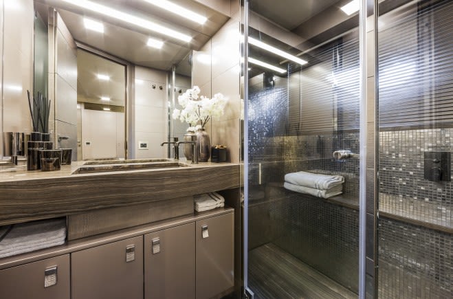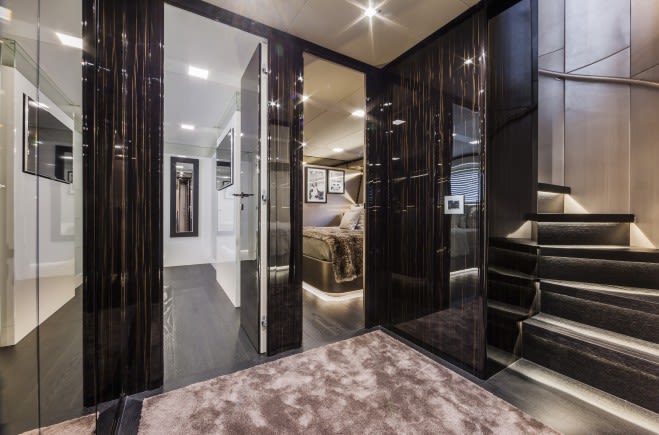 Каюта Владельца расположена в носовой части главной палубы, окна в каюте очень большие, в ней имеется широкий полноразмерный гардероб/комната для переодевания, а душевую можно трансформировать в турецкую парную.