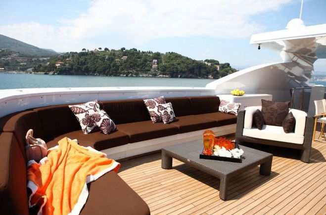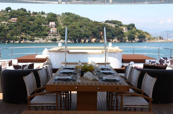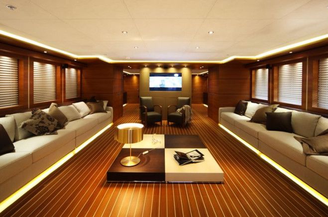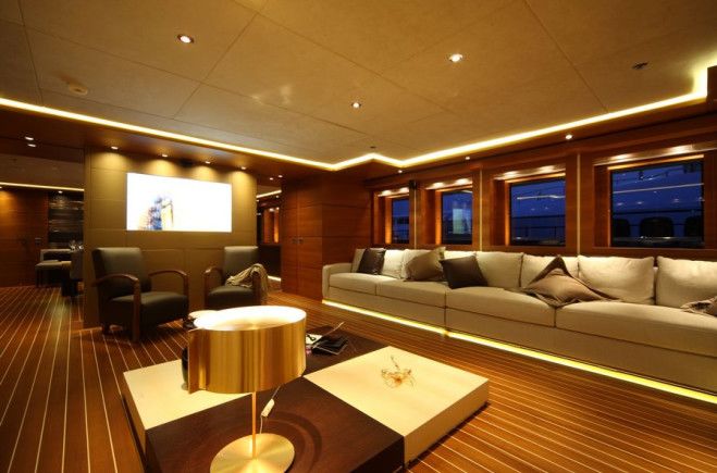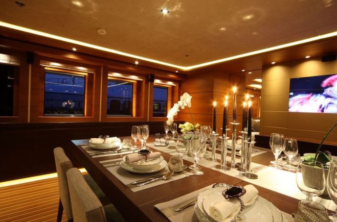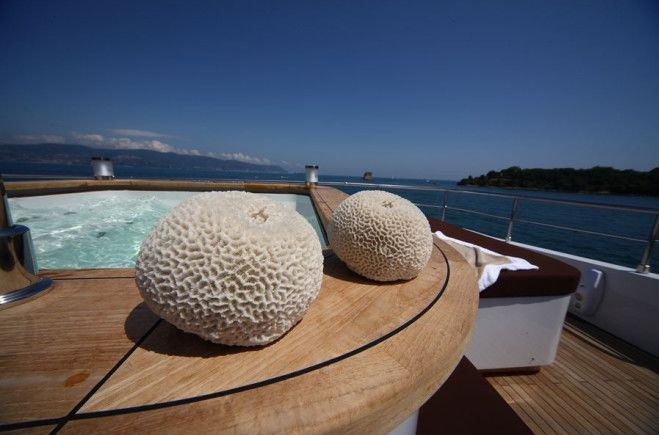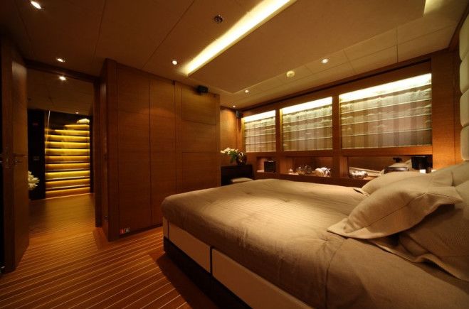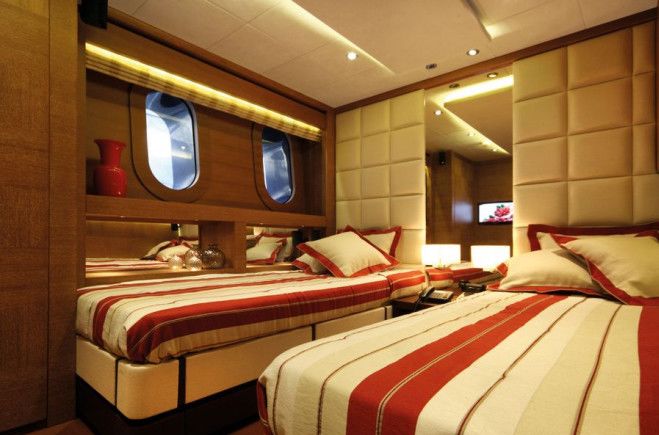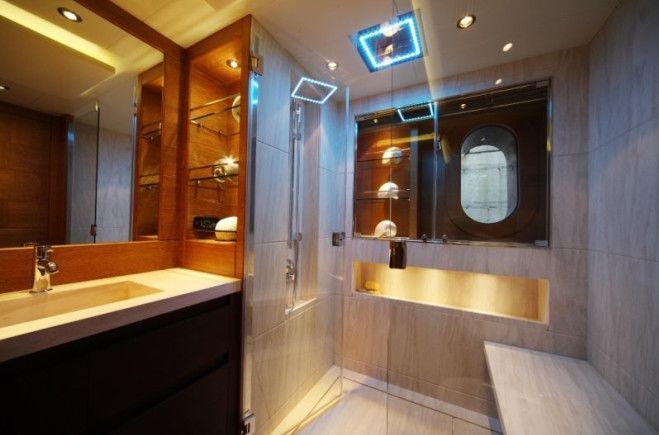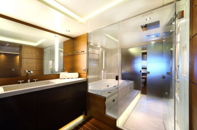 Upper deck: One master cabin with a king size bed, his and hers bathroom, jacuzzi, shower, steam bath & walk in closet. A private lounge area with an office, wine cellar and cigars humidifier, mini bar & a private deck area. One spa room with a steam bath. Main deck: One full beam VIP cabin with a king size bed, his & hers bathroom, jacuzzi, shower, steam bath, walk in closet, mini bar and an office area with two pullman berths. Lower deck: Two double cabins with a queen size bed and ensuite facilities (shower & steam bath). Two twin cabins with a pullman berth and ensuite facilities. A mini bar in the corridor RGB LED Lighting in all baths. Safe box in all cabins A Spa therapist offers spa treatments to all guests onboard during the charters.