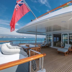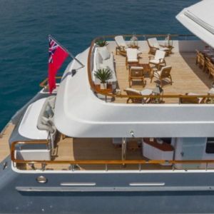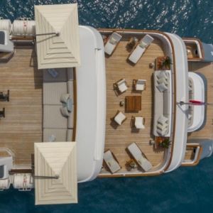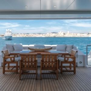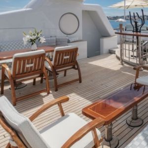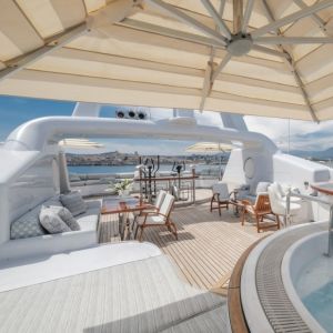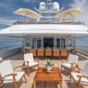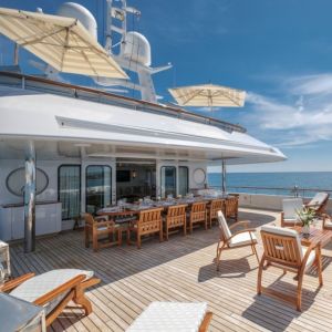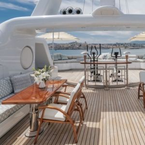 Сандек, верхняя прогулочная палуба этой 50-метровой супер-яхты — настоящая вершина дизайнерской мысли. Джакузи на этой палубе окружена лежаками для загара и шезлонгами, здесь же расположен бар, есть и столы для тех, кто захочет посидеть в некотором уединении.