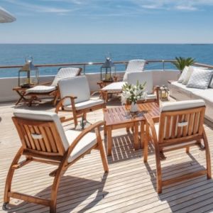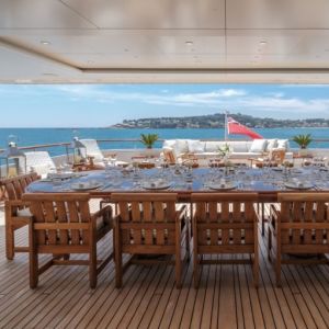 Для обедов на свежем воздухе оборудована великолепная обеденная зона на верхней палубе. Красивый стол овальной формы изготовлен из тикового дерева; 16 гостей, сидящих за этим столом, тень сандека защищает от жаркого солнца.