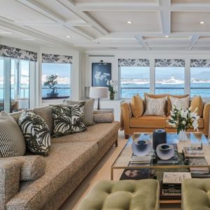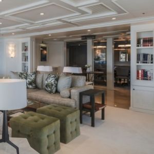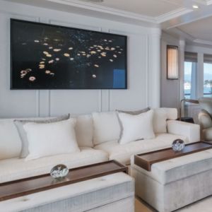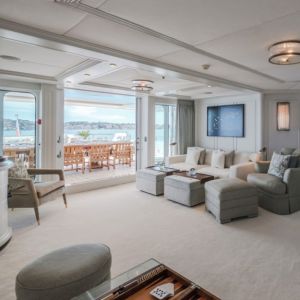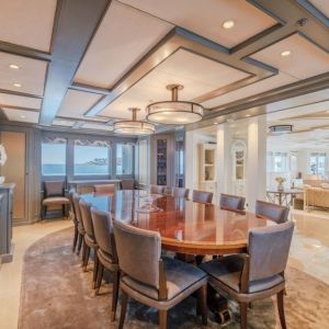 Вместительный салон на главной палубе яхты MOSAIQUE соединен с игровой комнатой, которая не уступает в элегантности остальным интерьерам. Сразу за игровой комнатой располагается обеденная зона со столом, за которым могут разместиться 12 человек.