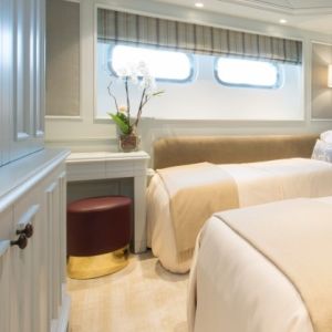 На борту яхты могут разместиться 12 гостей в просторных каютах. Успеху данной яхты в чартерах несомненно способствуют изысканные интерьеры, созданные гением Kristina Ferrand, и воплощенные в жизнь всемирно известной компанией Dubois Naval Architects.