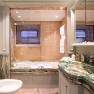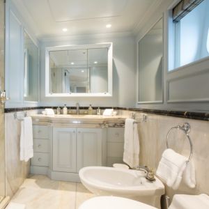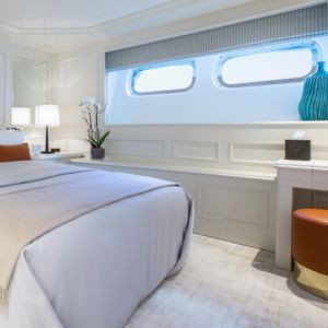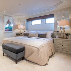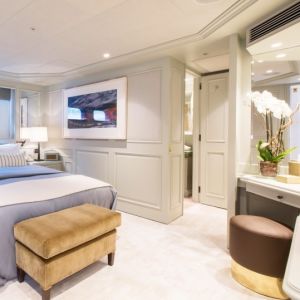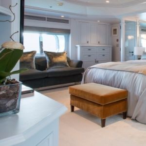 На главной палубе расположена каюта Владельца — впечатляющих размеров во всю ширину палубы, с собственным просторным кабинетом для работы во время путешествий, с отдельной гостиной и с ванной комнатой, отделанной мрамором и ониксом. Каюта Владельца задает высокую планку для остальных пяти кают, находящихся на верхней и нижней палубах. Полностью интегрированная аудио-видео система установлена во всех каютах, обеспечивая гостей отличным выбором развлечений на борту.