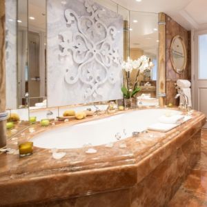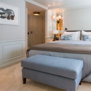 В интерьерах интересно использованы панели красного дерева в сочетании с деталями из сатинового дерева, а нейтрального цвета ковры служат связующим элемент гармонии интерьера в элегантный ансамбль. Салон на верхней палубе предлагает совсем иное настроение — здесь главенствуют светлые тона, эта восхитительная альтернатива словно приглашает расслабиться, повеселиться и отдаться отдыху в полной мере.