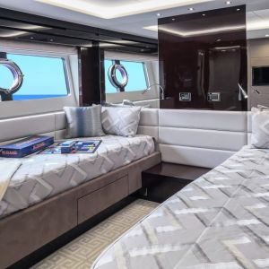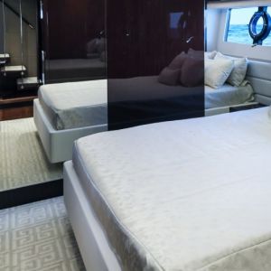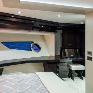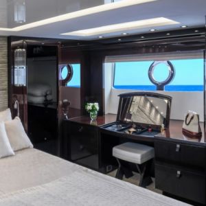 - Роскошная каюта владельца с кроватью кинг-сайз, ванной комнатой, гардеробной, туалетным столиком, кофейным уголком и бортовым балконом.
