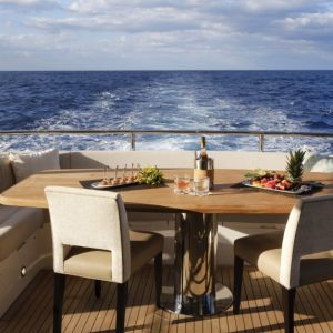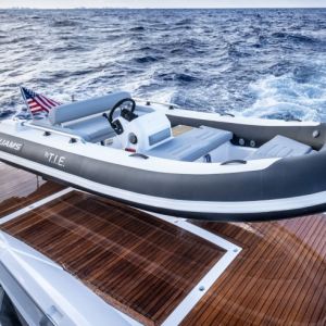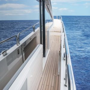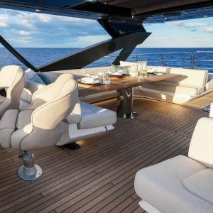 - Палуба, покрытая тиком, лестница для спуска в воду, гидравлические платформы для купания и тендера