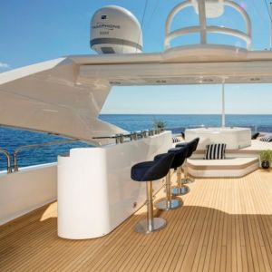 Лаунж верхней палубы яхты THE DEVOCEAN полностью посвящен отдыху и расслаблению, перед развлекательным центром оборудована прекрасная диванная зона, а в кормовой части верхней палубы обустроена еще одна обеденная зона на 12 персон — для фантастического ужина под звездами.